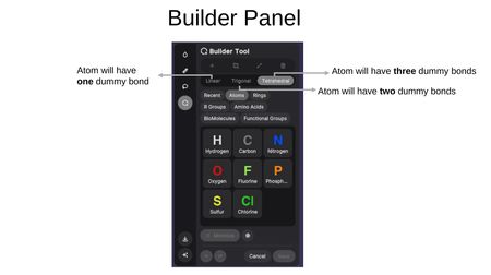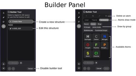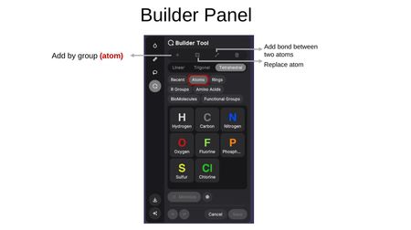 The Builder Tool enables 3D molecular construction and editing. Upon activation, you can choose to: