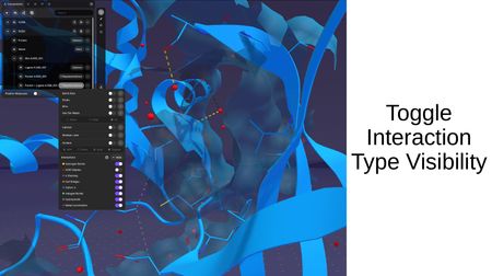 When interactions are computed between structures, you can toggle the visibility of individual interaction types: Hydrogen Bonds, VDW Clashes, π Stacking, Salt Bridges, Cation-π, Halogen Bonds, Hydrophobic, and Metal Coordination.