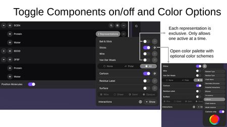 Clicking the representation button on a component opens the representation panel. Each representation type is exclusive — only one atomistic representation can be active at a time per component. The color palette icon opens color scheme options.