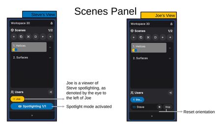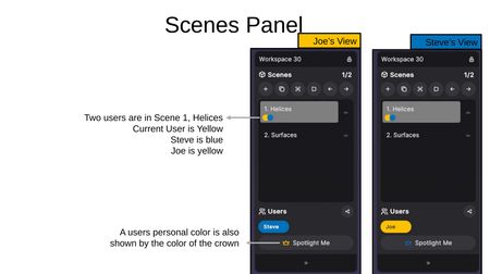 When multiple users are in a workspace, colored dots on each scene indicate which users are currently viewing that scene. Each user's personal color corresponds to their name tag in the Users section.