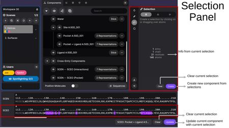 The Selection Panel shows information about the current selection (entry count, chains, residues, atoms) and provides: