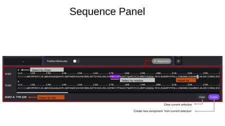 The Sequence Panel is opened by clicking the Sequences button at the bottom-right of the Components Tab. It displays the amino acid sequences of all loaded structures in a horizontal, scrollable view.