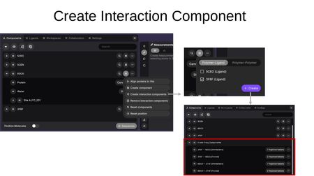 - Create interaction components — Compute interactions between structures. Choose between Polymer-Ligand and Polymer-Polymer modes, select the target entry, and click Create. This generates Cross-Entry Components showing interactions and pocket regions between the selected structures.