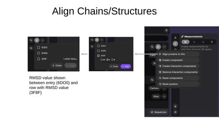 - Align proteins to this — Align other structures to this entry. Select target entries and specific chains (All, A, B, etc.), then click Align. After alignment, RMSD values are displayed between entries.