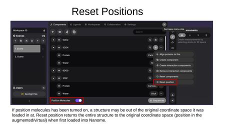 - Reset position — Returns a structure to its original coordinate space. This is useful if Position Molecules was toggled on and a structure was moved out of its original position.