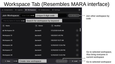 The Workspaces Tab allows you to manage, create, and navigate between workspaces. The interface resembles the MARA web interface.